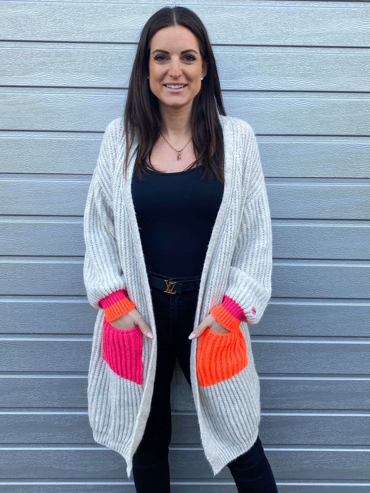 Oversize geschnittene Strickjacke mit farbig abgesetzten Taschen und Ärmelbündchen. Die Strickjacke ist wunderschön gestrickt mit Bündchen an den Ärmeln. Material: 42% Polyacryl, 30% Polyamid, 14% Wolle, 14% Viskose Größe: Onesize (passt Gr. 34 bis ca 42/44) Passform: gerade geschnitten, leicht oversize MADE IN ITALY.